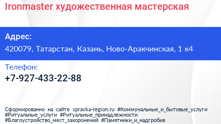 Ironmaster, художественная мастерская по адресу 420079, Татарстан, Казань, Ново-Аракчинская, 1 к4 в дальнейшем Организация, размещена в следующих категориях: