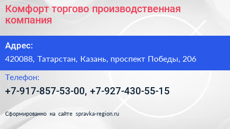 Комфорт, торгово-производственная компания по адресу 420088, Татарстан, Казань, проспект Победы, 206 в дальнейшем Организация, размещена в следующих категориях: