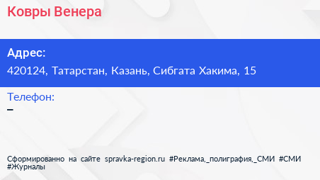Ковры Венера по адресу 420124, Татарстан, Казань, Сибгата Хакима, 15 в дальнейшем Организация, размещена в следующих категориях: