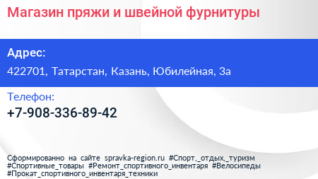 Магазин пряжи и швейной фурнитуры по адресу 422701, Татарстан, Казань, Юбилейная, 3а в дальнейшем Организация, размещена в следующих категориях: