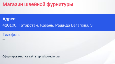 Магазин швейной фурнитуры по адресу 420100, Татарстан, Казань, Рашида Вагапова, 3 в дальнейшем Организация, размещена в следующих категориях: