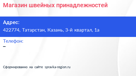 Магазин швейных принадлежностей по адресу 422774, Татарстан, Казань, 3-й квартал, 1а в дальнейшем Организация, размещена в следующих категориях: