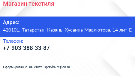 Магазин текстиля по адресу 420101, Татарстан, Казань, Хусаина Мавлютова, 14 лит Е в дальнейшем Организация, размещена в следующих категориях: