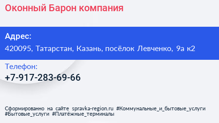 Оконный Барон, компания по адресу 420095, Татарстан, Казань, посёлок Левченко, 9а к2 в дальнейшем Организация, размещена в следующих категориях: