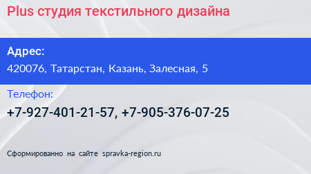 Plus, студия текстильного дизайна по адресу 420076, Татарстан, Казань, Залесная, 5 в дальнейшем Организация, размещена в следующих категориях: