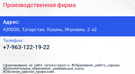 Производственная фирма по адресу 420030, Татарстан, Казань, Жуковка, 2 к2 в дальнейшем Организация, размещена в следующих категориях: