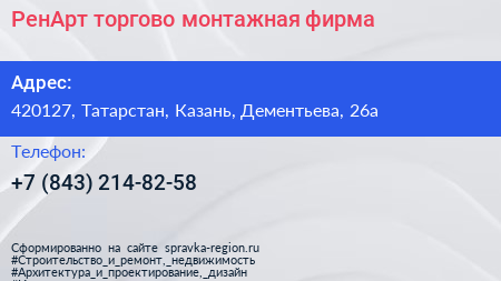 РенАрт, торгово-монтажная фирма по адресу 420127, Татарстан, Казань, Дементьева, 26а в дальнейшем Организация, размещена в следующих категориях:
