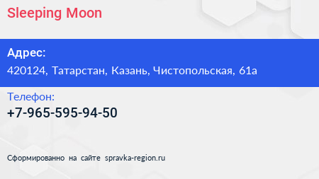 Sleeping Moon по адресу 420124, Татарстан, Казань, Чистопольская, 61а в дальнейшем Организация, размещена в следующих категориях: