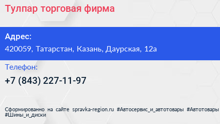 Тулпар, торговая фирма по адресу 420059, Татарстан, Казань, Даурская, 12а в дальнейшем Организация, размещена в следующих категориях: