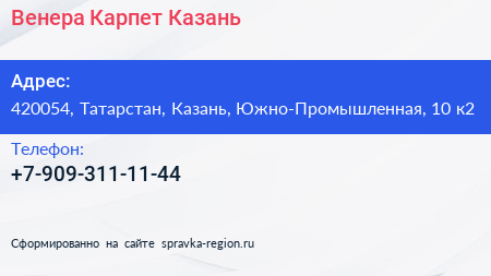 Венера Карпет Казань по адресу 420054, Татарстан, Казань, Южно-Промышленная, 10 к2 в дальнейшем Организация, размещена в следующих категориях:
