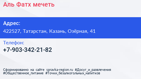 Аль-Фатх, мечеть по адресу 422527, Татарстан, Казань, Озёрная, 41 в дальнейшем Организация, размещена в следующих категориях: