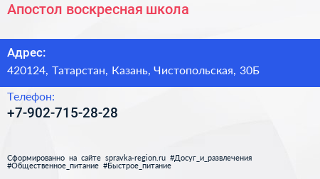 Апостол, воскресная школа по адресу 420124, Татарстан, Казань, Чистопольская, 30Б в дальнейшем Организация, размещена в следующих категориях: