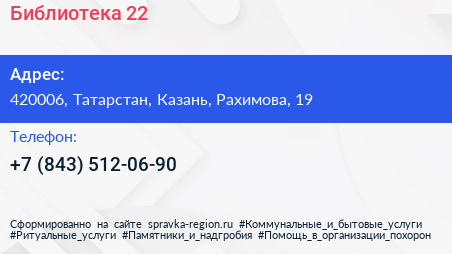 Библиотека №22 по адресу 420006, Татарстан, Казань, Рахимова, 19 в дальнейшем Организация, размещена в следующих категориях: