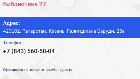 Библиотека №27 по адресу 420102, Татарстан, Казань, Галимджана Баруди, 25а в дальнейшем Организация, размещена в следующих категориях: