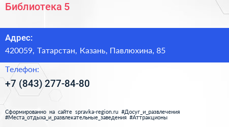 Библиотека №5 по адресу 420059, Татарстан, Казань, Павлюхина, 85 в дальнейшем Организация, размещена в следующих категориях: