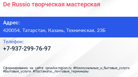 De Russio, творческая мастерская по адресу 420054, Татарстан, Казань, Техническая, 23Б в дальнейшем Организация, размещена в следующих категориях: