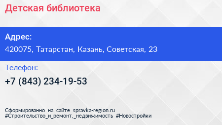 Детская библиотека по адресу 420075, Татарстан, Казань, Советская, 23 в дальнейшем Организация, размещена в следующих категориях: