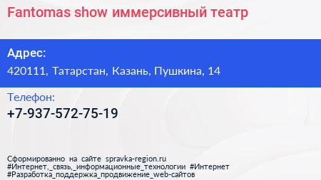 Fantomas-show, иммерсивный театр по адресу 420111, Татарстан, Казань, Пушкина, 14 в дальнейшем Организация, размещена в следующих категориях: