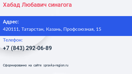 Хабад-Любавич, синагога по адресу 420111, Татарстан, Казань, Профсоюзная, 15 в дальнейшем Организация, размещена в следующих категориях: