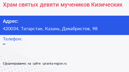 Храм святых девяти мучеников Кизических по адресу 420034, Татарстан, Казань, Декабристов, 98 в дальнейшем Организация, размещена в следующих категориях: