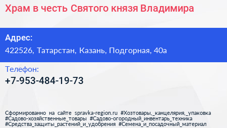 Храм в честь Святого князя Владимира по адресу 422526, Татарстан, Казань, Подгорная, 40а в дальнейшем Организация, размещена в следующих категориях: