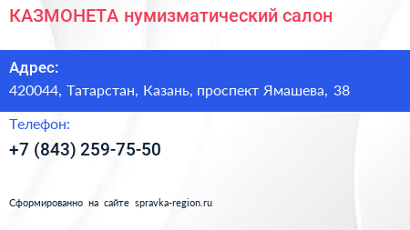 КАЗМОНЕТА, нумизматический салон по адресу 420044, Татарстан, Казань, проспект Ямашева, 38 в дальнейшем Организация, размещена в следующих категориях: