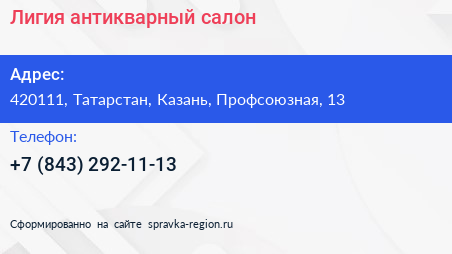 Лигия, антикварный салон по адресу 420111, Татарстан, Казань, Профсоюзная, 13 в дальнейшем Организация, размещена в следующих категориях: