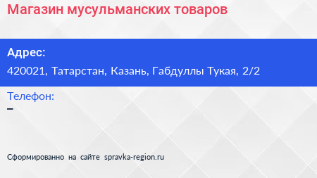 Магазин мусульманских товаров по адресу 420021, Татарстан, Казань, Габдуллы Тукая, 2/2 в дальнейшем Организация, размещена в следующих категориях: