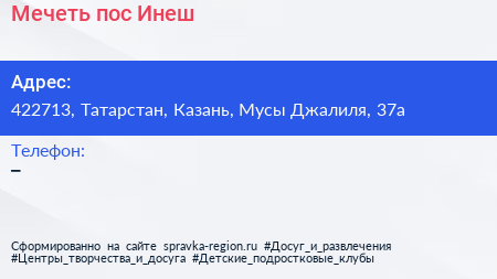 Мечеть, пос. Инеш по адресу 422713, Татарстан, Казань, Мусы Джалиля, 37а в дальнейшем Организация, размещена в следующих категориях: