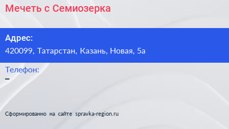 Мечеть, с. Семиозерка по адресу 420099, Татарстан, Казань, Новая, 5а в дальнейшем Организация, размещена в следующих категориях: