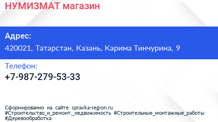 НУМИЗМАТ, магазин по адресу 420021, Татарстан, Казань, Карима Тинчурина, 9 в дальнейшем Организация, размещена в следующих категориях:
