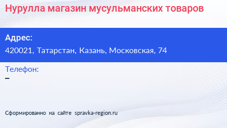 Нурулла, магазин мусульманских товаров по адресу 420021, Татарстан, Казань, Московская, 74 в дальнейшем Организация, размещена в следующих категориях: