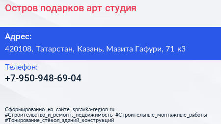 Остров подарков, арт-студия по адресу 420108, Татарстан, Казань, Мазита Гафури, 71 к3 в дальнейшем Организация, размещена в следующих категориях:
