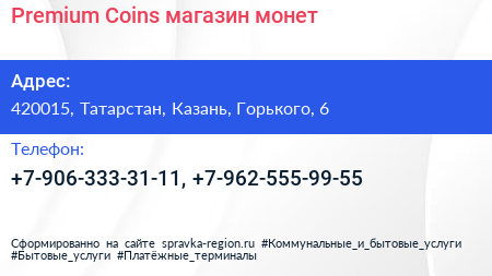 Premium Coins, магазин монет по адресу 420015, Татарстан, Казань, Горького, 6 в дальнейшем Организация, размещена в следующих категориях: