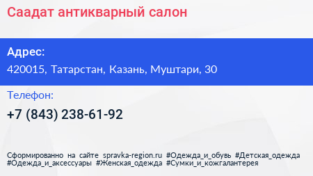 Саадат, антикварный салон по адресу 420015, Татарстан, Казань, Муштари, 30 в дальнейшем Организация, размещена в следующих категориях: