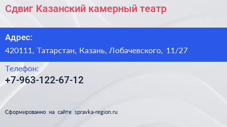 Сдвиг, Казанский камерный театр по адресу 420111, Татарстан, Казань, Лобачевского, 11/27 в дальнейшем Организация, размещена в следующих категориях: