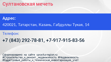 Султановская мечеть по адресу 420021, Татарстан, Казань, Габдуллы Тукая, 14 в дальнейшем Организация, размещена в следующих категориях: