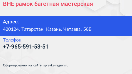 ВНЕ рамок, багетная мастерская по адресу 420124, Татарстан, Казань, Четаева, 58Б в дальнейшем Организация, размещена в следующих категориях: