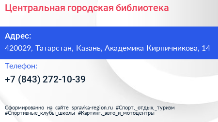 Центральная городская библиотека по адресу 420029, Татарстан, Казань, Академика Кирпичникова, 14 в дальнейшем Организация, размещена в следующих категориях:
