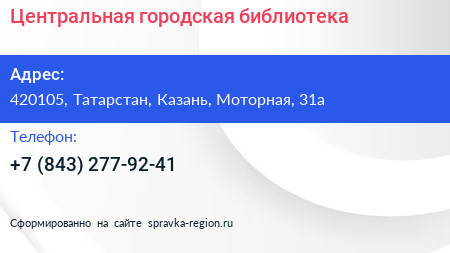Центральная городская библиотека по адресу 420105, Татарстан, Казань, Моторная, 31а в дальнейшем Организация, размещена в следующих категориях: