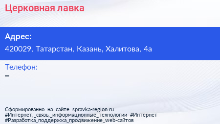 Церковная лавка по адресу 420029, Татарстан, Казань, Халитова, 4а в дальнейшем Организация, размещена в следующих категориях: