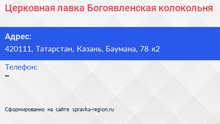 Церковная лавка, Богоявленская колокольня по адресу 420111, Татарстан, Казань, Баумана, 78 к2 в дальнейшем Организация, размещена в следующих категориях: