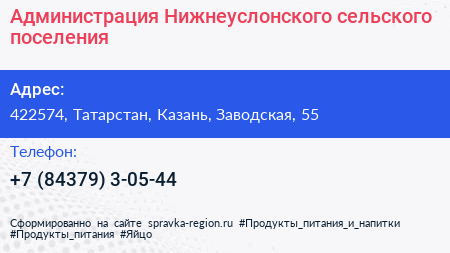 Администрация Нижнеуслонского сельского поселения по адресу 422574, Татарстан, Казань, Заводская, 55 в дальнейшем Организация, размещена в следующих категориях: