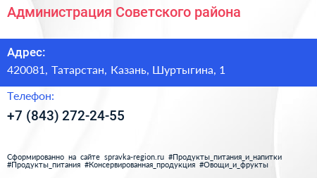 Администрация Советского района по адресу 420081, Татарстан, Казань, Шуртыгина, 1 в дальнейшем Организация, размещена в следующих категориях: