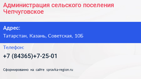 Администрация сельского поселения Чепчуговское по адресу Татарстан, Казань, Советская, 10Б в дальнейшем Организация, размещена в следующих категориях: