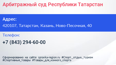 Арбитражный суд Республики Татарстан по адресу 420107, Татарстан, Казань, Ново-Песочная, 40 в дальнейшем Организация, размещена в следующих категориях: