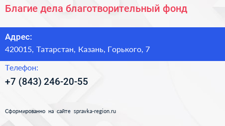 Благие дела, благотворительный фонд по адресу 420015, Татарстан, Казань, Горького, 7 в дальнейшем Организация, размещена в следующих категориях:
