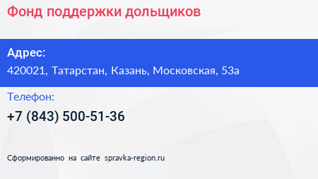Фонд поддержки дольщиков по адресу 420021, Татарстан, Казань, Московская, 53а в дальнейшем Организация, размещена в следующих категориях: