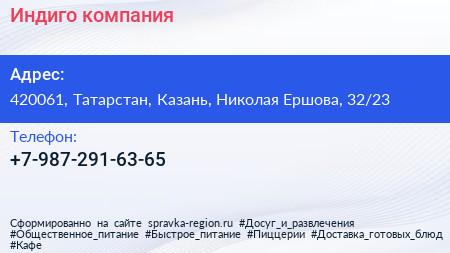 Индиго, компания по адресу 420061, Татарстан, Казань, Николая Ершова, 32/23 в дальнейшем Организация, размещена в следующих категориях: