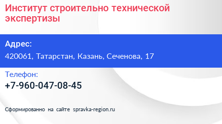 Институт строительно-технической экспертизы по адресу 420061, Татарстан, Казань, Сеченова, 17 в дальнейшем Организация, размещена в следующих категориях: